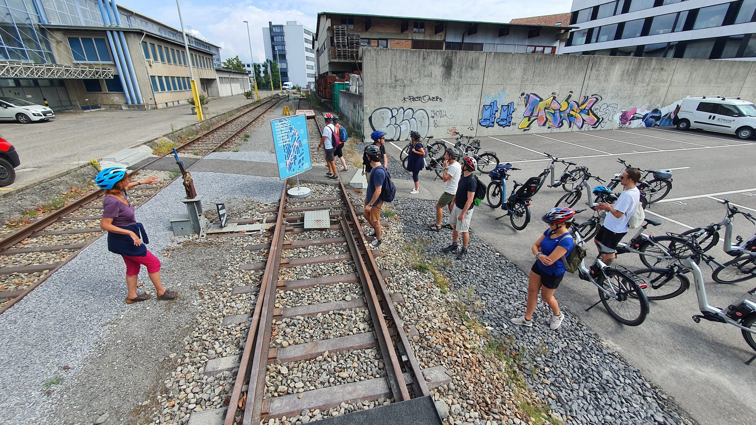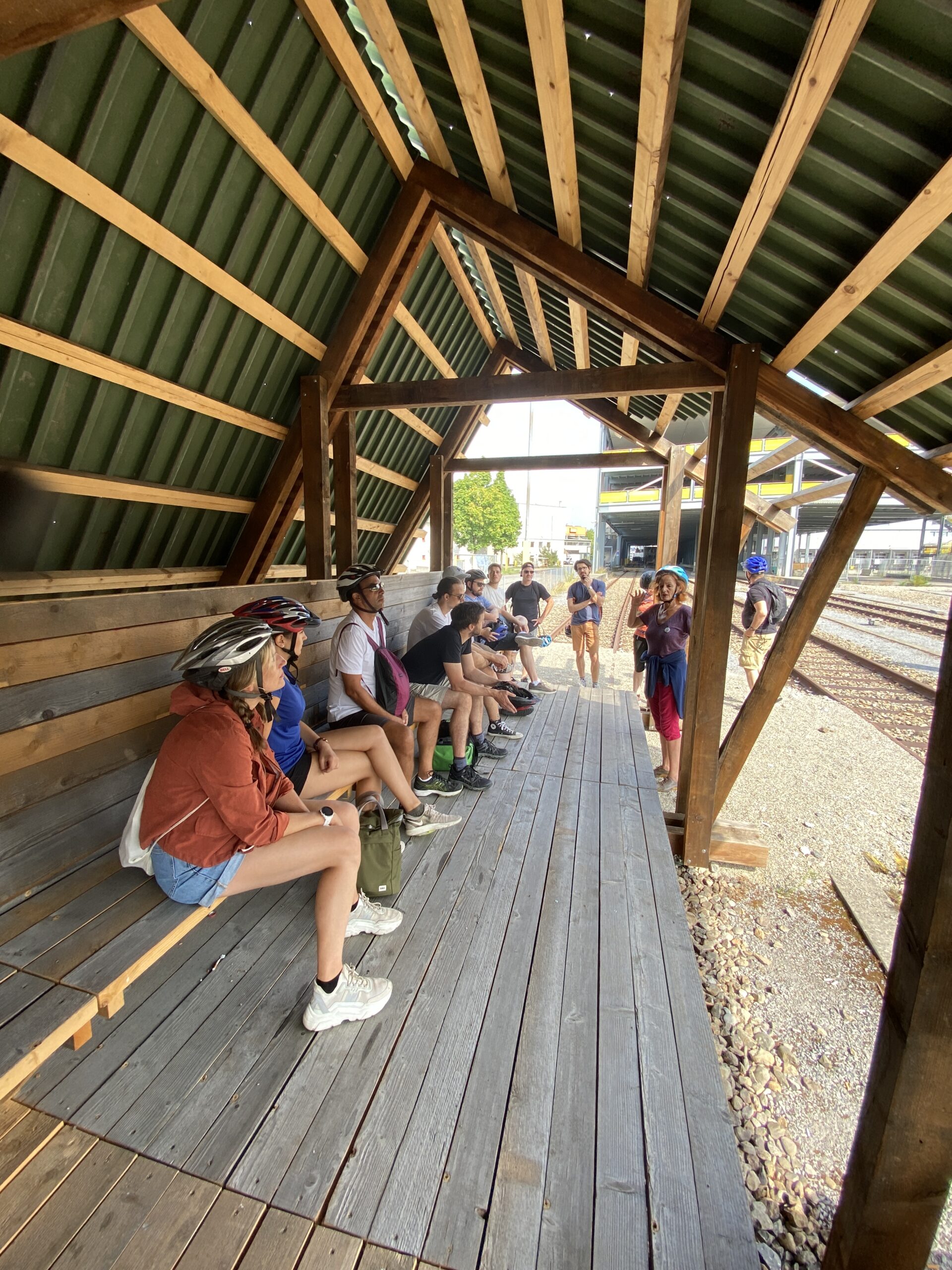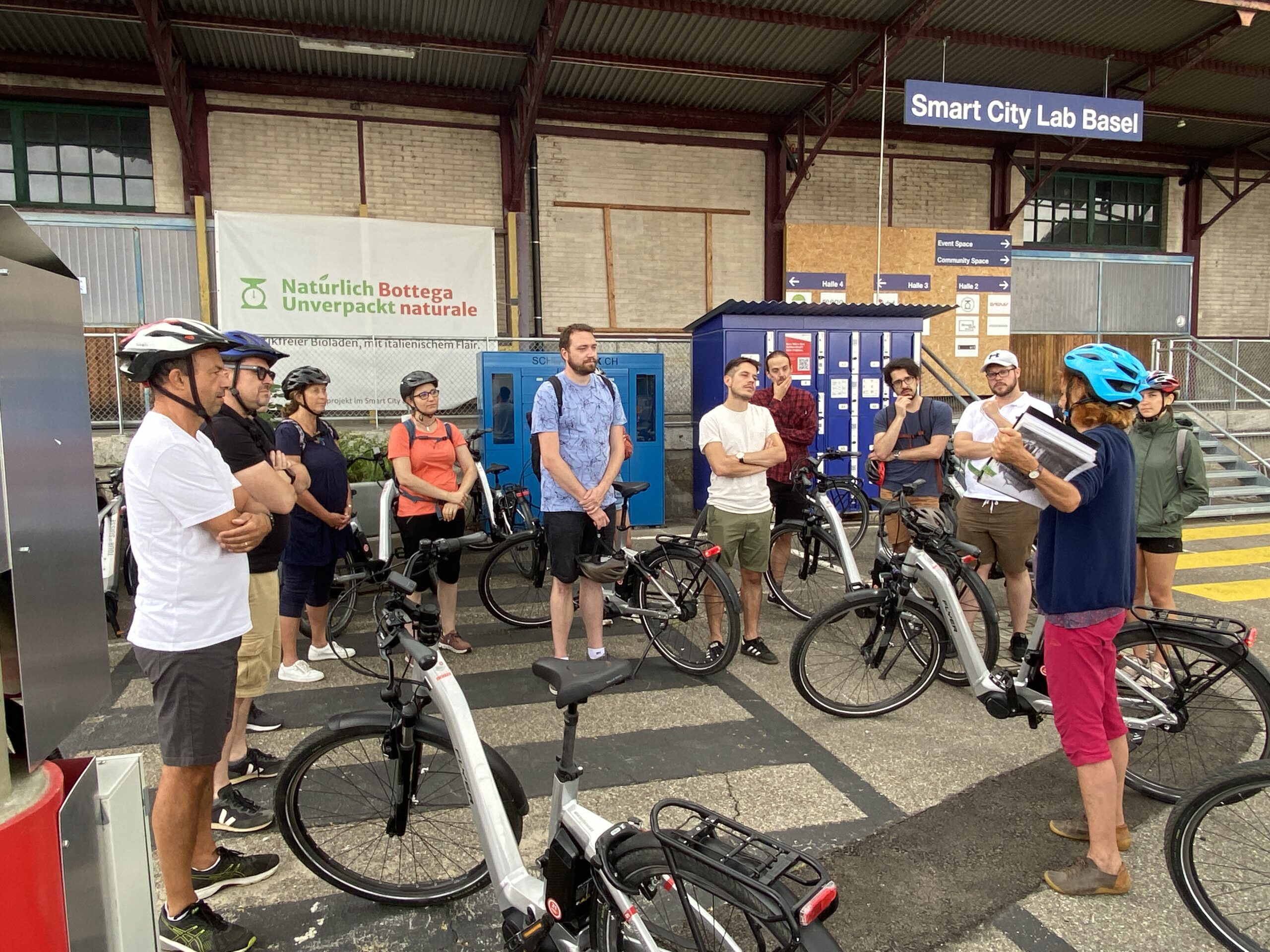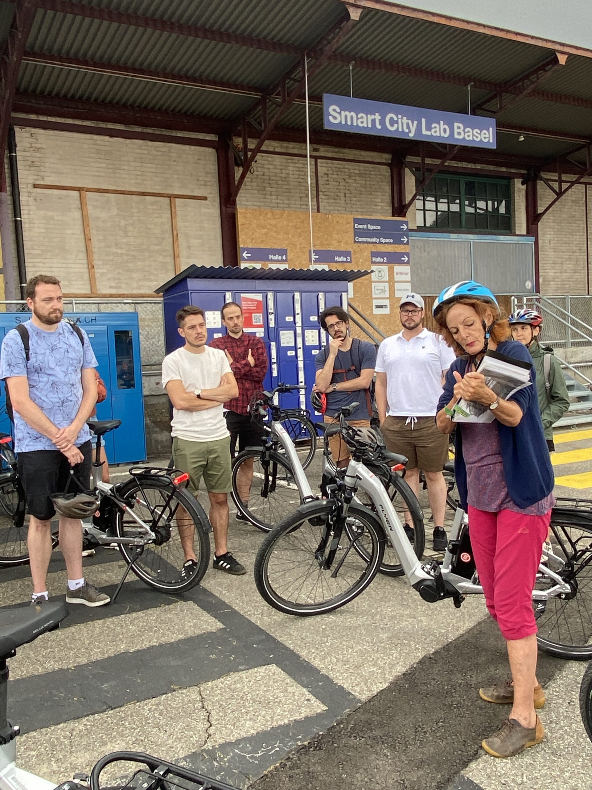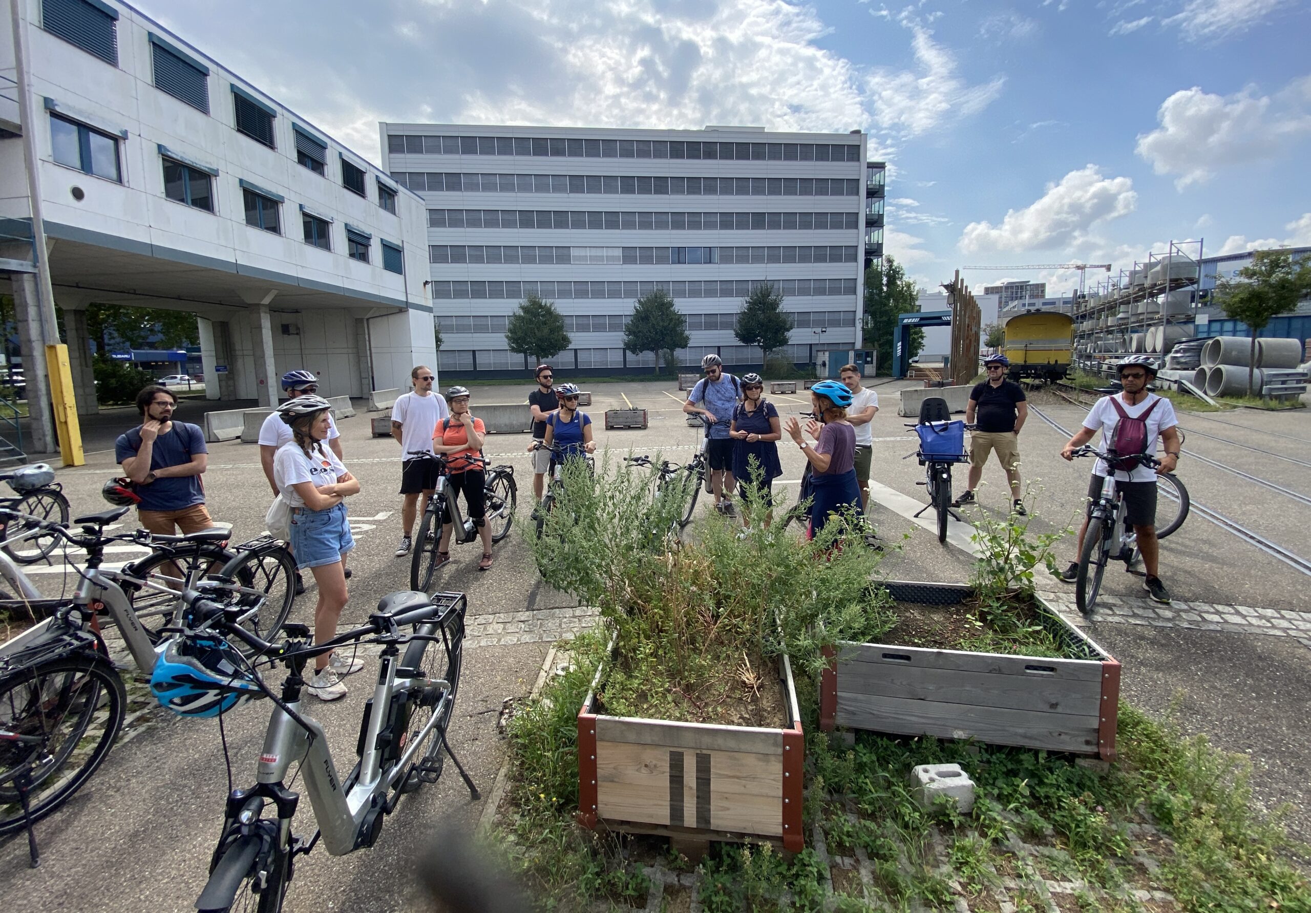 Les collaborateurs d’objectif:ne ont pu aborder de nombreux thèmes à la fois innovants et caractéristiques de leur pratique, sur leur chemin à vélo électrique avec Monique Chevalley, guide-interprète du patrimoine (formée dans le cadre d’une association fondée par nos Régions). Par le développement de nombreux nouveaux quartiers, Bâle démontre que différentes méthodes permettent d’obtenir des développements harmonieux, entre réalisations d’architectes de renom (Herzog & de Meuron), préservation d’un patrimoine industriel (ancienne brasserie Wartek), place laissée à l’innovation (au Smart City Lab Basel, on récupère les batteries des vélos et trottinettes électriques pour les reconditionner), lieux dédiés à l’économie circulaire comme à de nouveaux modes de travail et recherches sur la contribution des toits végétalisés à la biodiversité. L’appropriation des lieux par leurs usagers peut se faire de manière extrêmement planifiée comme de façon quasiment libre, en passant par des processus participatifs.